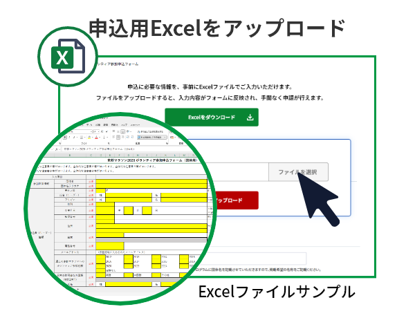 今年から、必要事項を入力した申込用Excelファイルをアップロードすることで、申込申請できる機能を追加しました。