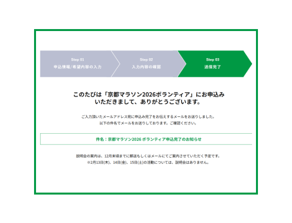 ◎京都マラソンを円滑に運営することを目的とし、活動内容連絡・説明会開催連絡・出欠管理・関連資料発送・登録情報の確認連絡・アンケートやレポート依頼・傷害保険申込み等のために利用します。
